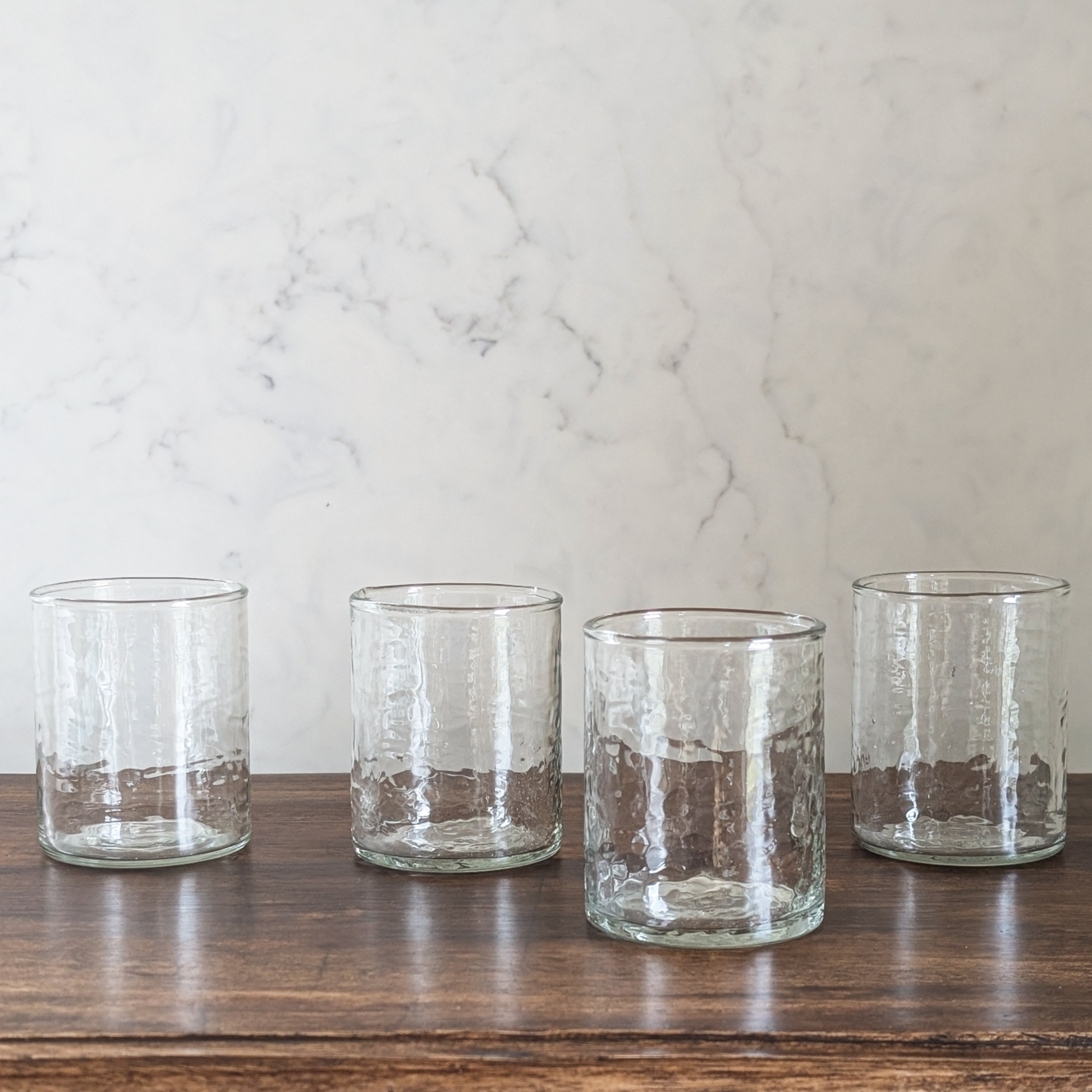 Ethically made from 100% recycled glass in India, our Handblown glasses feature a beautiful hammered finish. These glass tumblers combine a classic cylindrical shape with a subtle, textured finish that gives each one a unique character. Perfectly sized for water, juice, or your favourite cocktail, they're both practical and beautiful.
