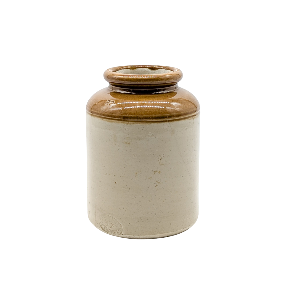 A classic example of utilitarian beauty, this two-tone glazed stoneware pot features a warm caramel top and natural clay base. It's simple cylindrical form and textured finish bring rustic charm and understated elegance to any space. Perfect for holding utensils, flowers, or standing solo as a sculptural accent.